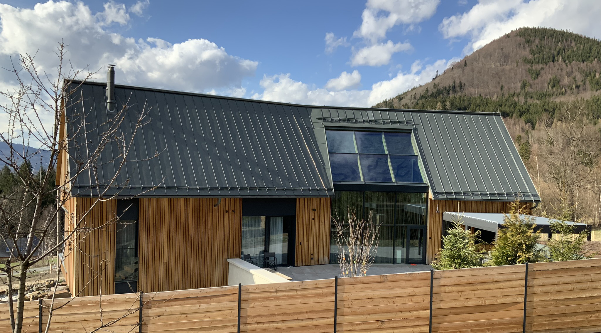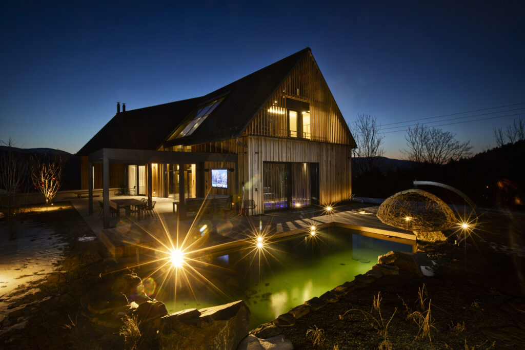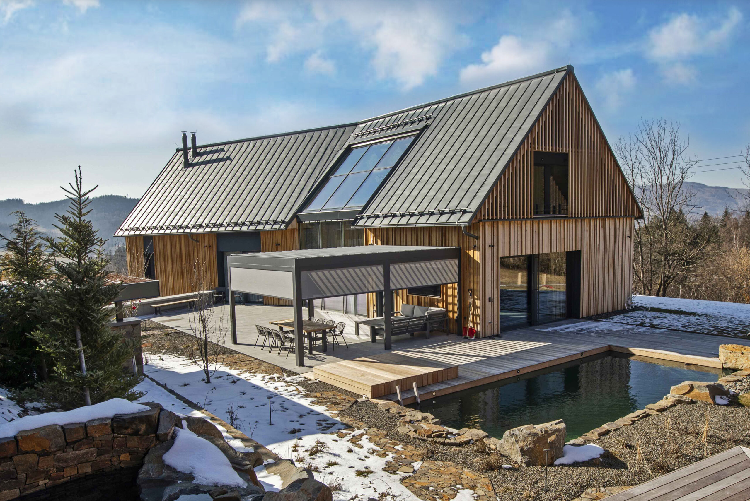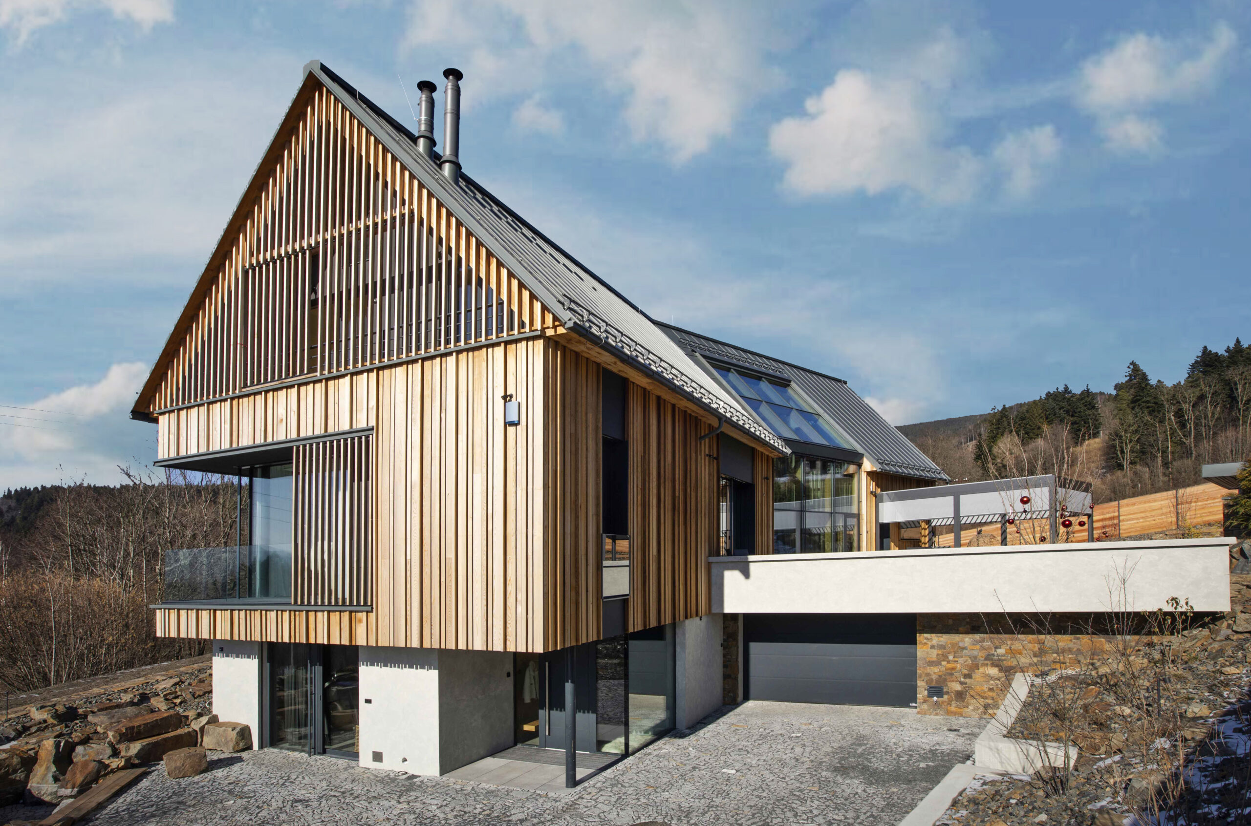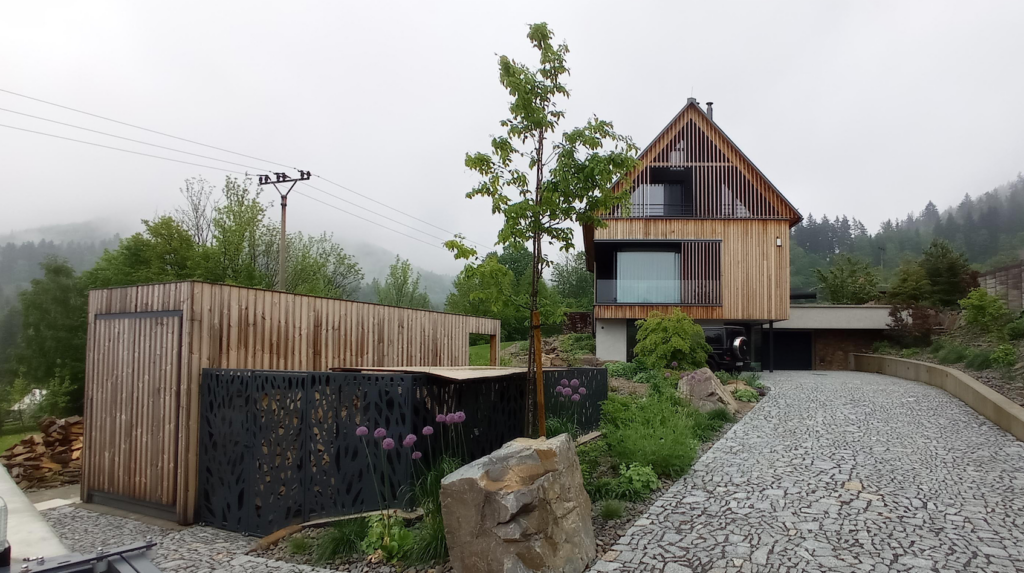 Rodinný dům byl navržen na samotné patě Lysé hory ve svažitém terénu s výhledem do údolí malebné podhorské obce Ostravice. Při návrhu jsme čelili několika výzvám. Stavba je umístěná na území CHKO Beskydy, tudíž bylo třeba ctít zásady řešení staveb v této oblast. Druhou výzvou byla netypicky tvarovaná stavební parcela v podobě relativně úzkého pásu kolmo se svahem. Odpovědi na tyto limity je zalomená půdorysná hmota s klasickou sedlovou střechu. Tato tradiční forma je dotvořená moderními minimalistickými tvary a materiály, které nechají vyznít čistotu celého projektu. Podzemní patro, které je ze strany příjezdu na terénu je zároveň nástupním, nicméně svou plochu expanduje z půdorysu viditelné hmoty a je z horní strany přesypáno terénem. Dům v přízemí a podkroví poskytuje veškeré potřebné prostory pro nadstandardní bydlení. Součástí prostor je také malé wellness s bazénem, nebo dominantní zimní zahrada s plastikou kamenného stromu. Dům je velkoryse propojen jako jeden velký vnitřní prostor, který je otevřen prosklenými stěnami na všechny strany, čímž je dotován v každé denní hodině dostatkem světla a nabízí vzájemné vizuální propojení různých místností interiéru. V projektu byl kladen velký důraz na detail jak v interiéru tak v exteriéru. V interiéru stojí za zmínku vnitřní otevřené schodiště z betonové skořepiny, nebo zastřešení zimní zakrady. V exteriéri je dům scelen 3d dřevěnou fasádou z čistého cedrou.