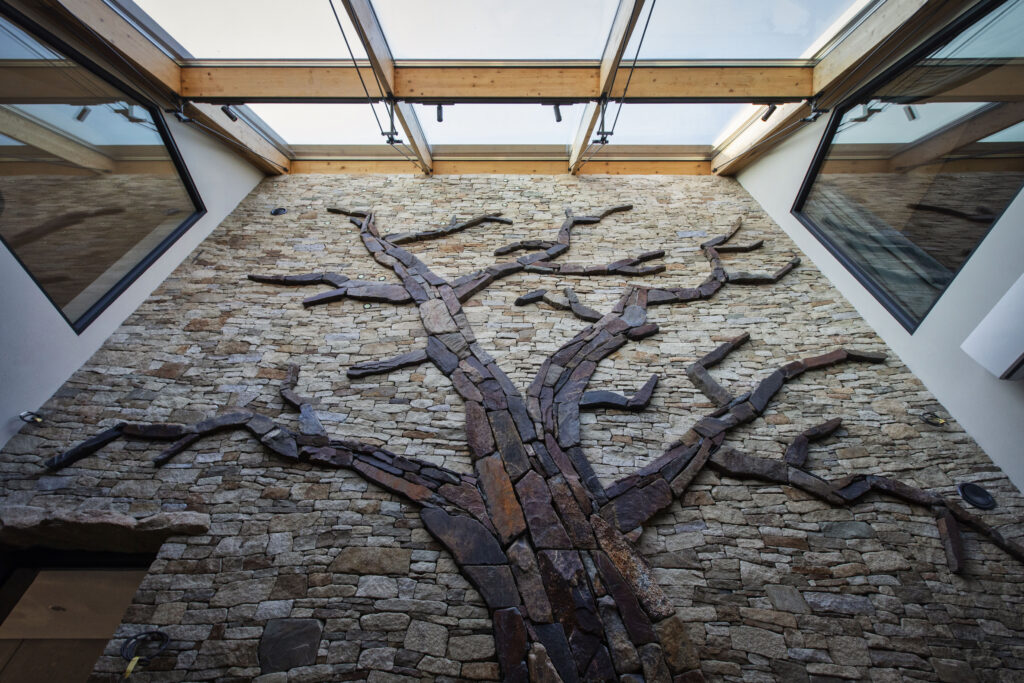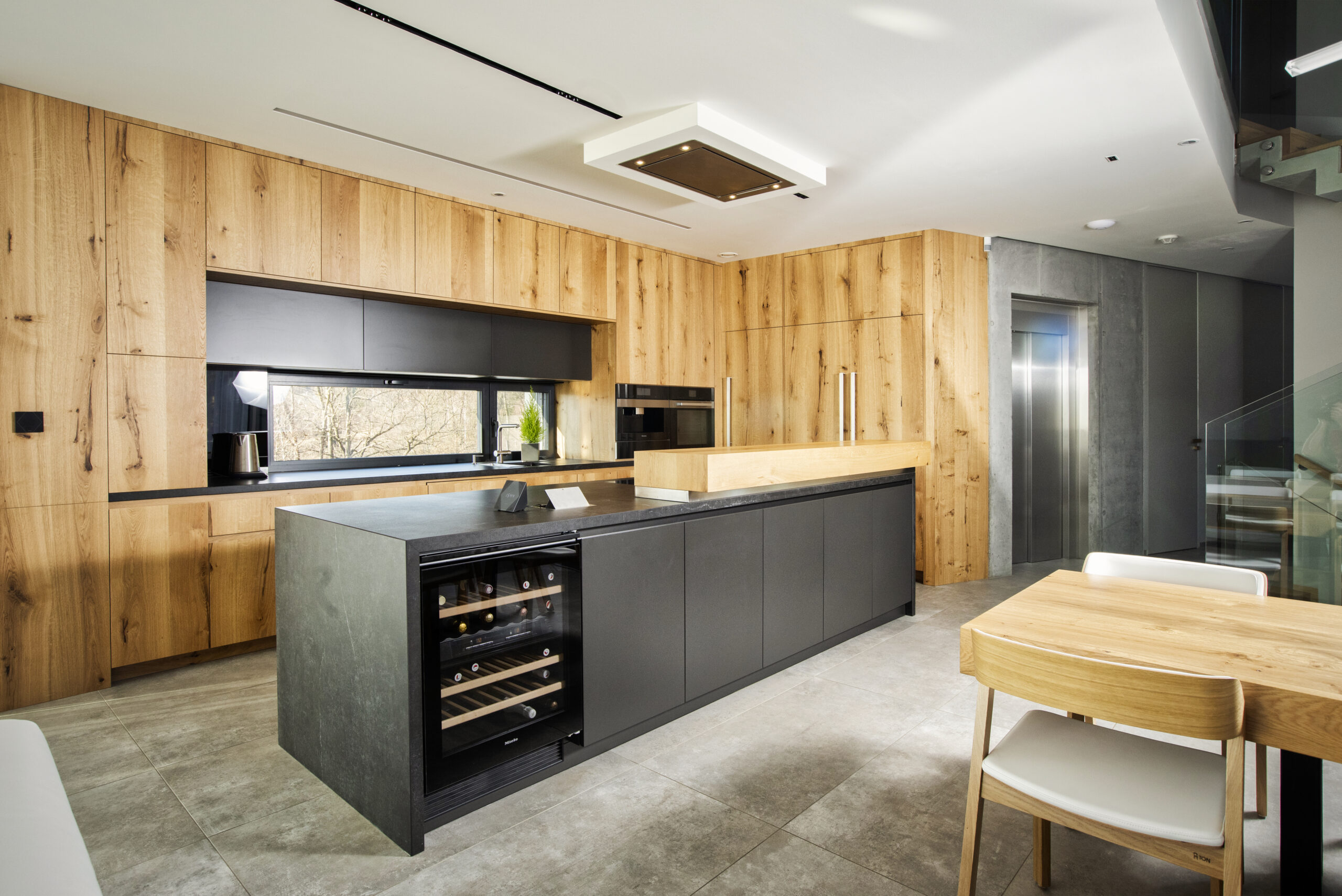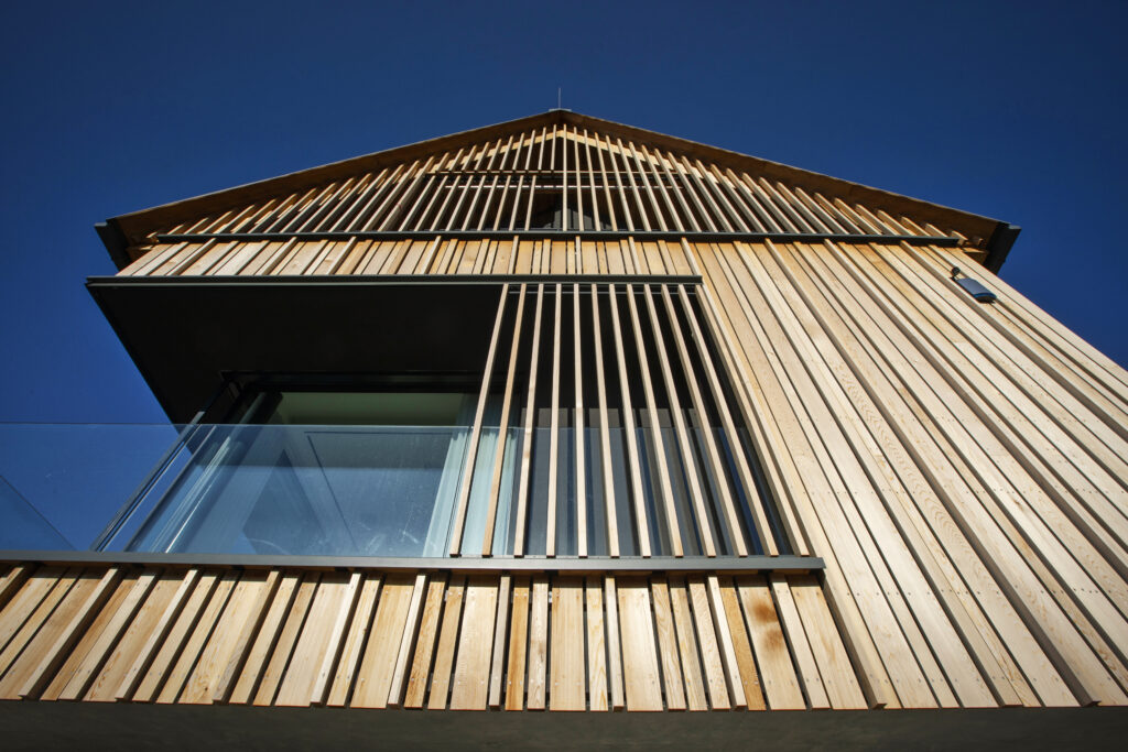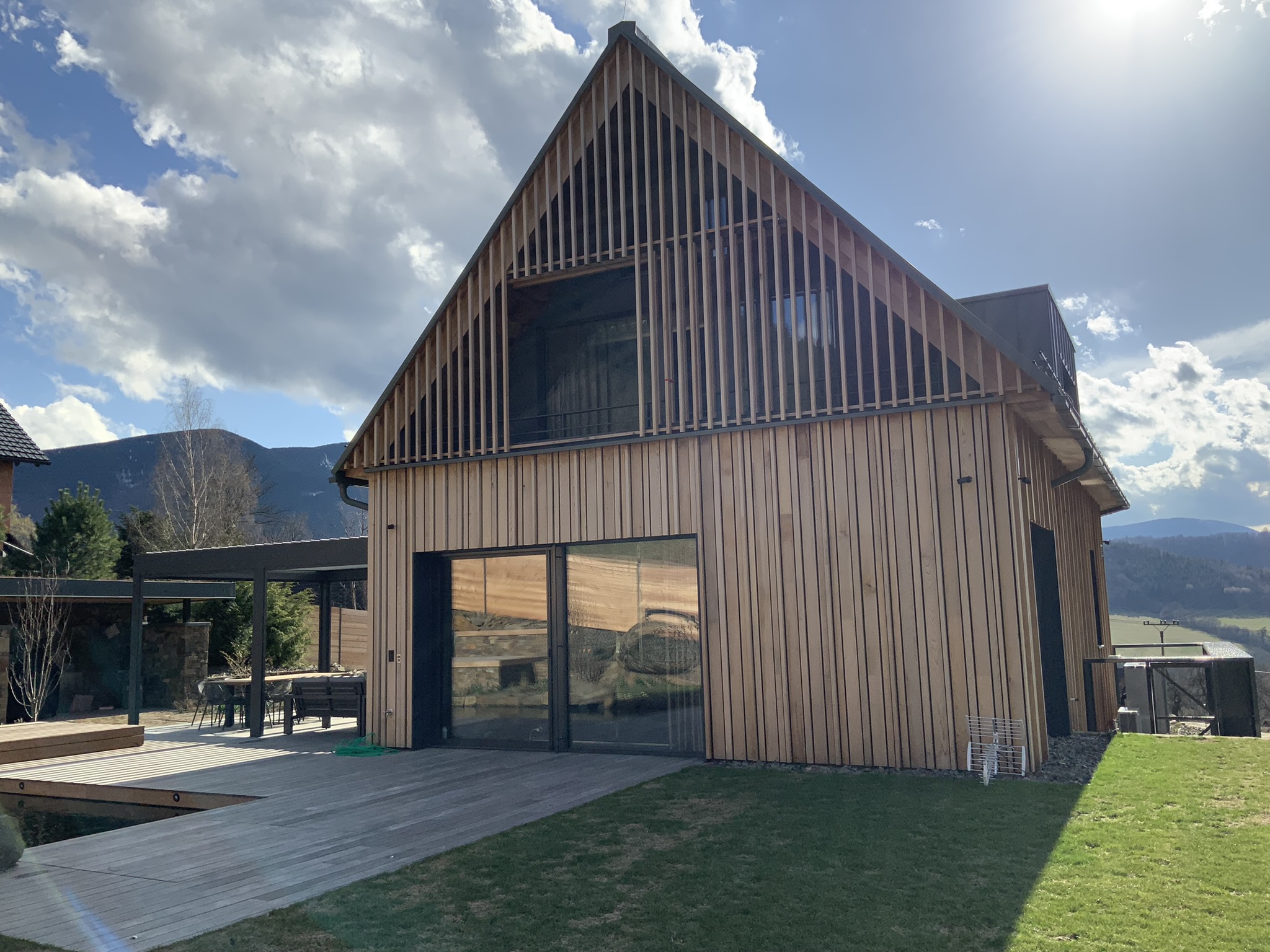 Rodinný dům byl navržen na samotné patě Lysé hory ve svažitém terénu s výhledem do údolí malebné podhorské obce Ostravice. Při návrhu jsme čelili několika výzvám. Stavba je umístěná na území CHKO Beskydy, tudíž bylo třeba ctít zásady řešení staveb v této oblast. Druhou výzvou byla netypicky tvarovaná stavební parcela v podobě relativně úzkého pásu kolmo se svahem. Odpovědi na tyto limity je zalomená půdorysná hmota s klasickou sedlovou střechu. Tato tradiční forma je dotvořená moderními minimalistickými tvary a materiály, které nechají vyznít čistotu celého projektu. Podzemní patro, které je ze strany příjezdu na terénu je zároveň nástupním, nicméně svou plochu expanduje z půdorysu viditelné hmoty a je z horní strany přesypáno terénem. Dům v přízemí a podkroví poskytuje veškeré potřebné prostory pro nadstandardní bydlení. Součástí prostor je také malé wellness s bazénem, nebo dominantní zimní zahrada s plastikou kamenného stromu. Dům je velkoryse propojen jako jeden velký vnitřní prostor, který je otevřen prosklenými stěnami na všechny strany, čímž je dotován v každé denní hodině dostatkem světla a nabízí vzájemné vizuální propojení různých místností interiéru. V projektu byl kladen velký důraz na detail jak v interiéru tak v exteriéru. V interiéru stojí za zmínku vnitřní otevřené schodiště z betonové skořepiny, nebo zastřešení zimní zakrady. V exteriéri je dům scelen 3d dřevěnou fasádou z čistého cedrou.